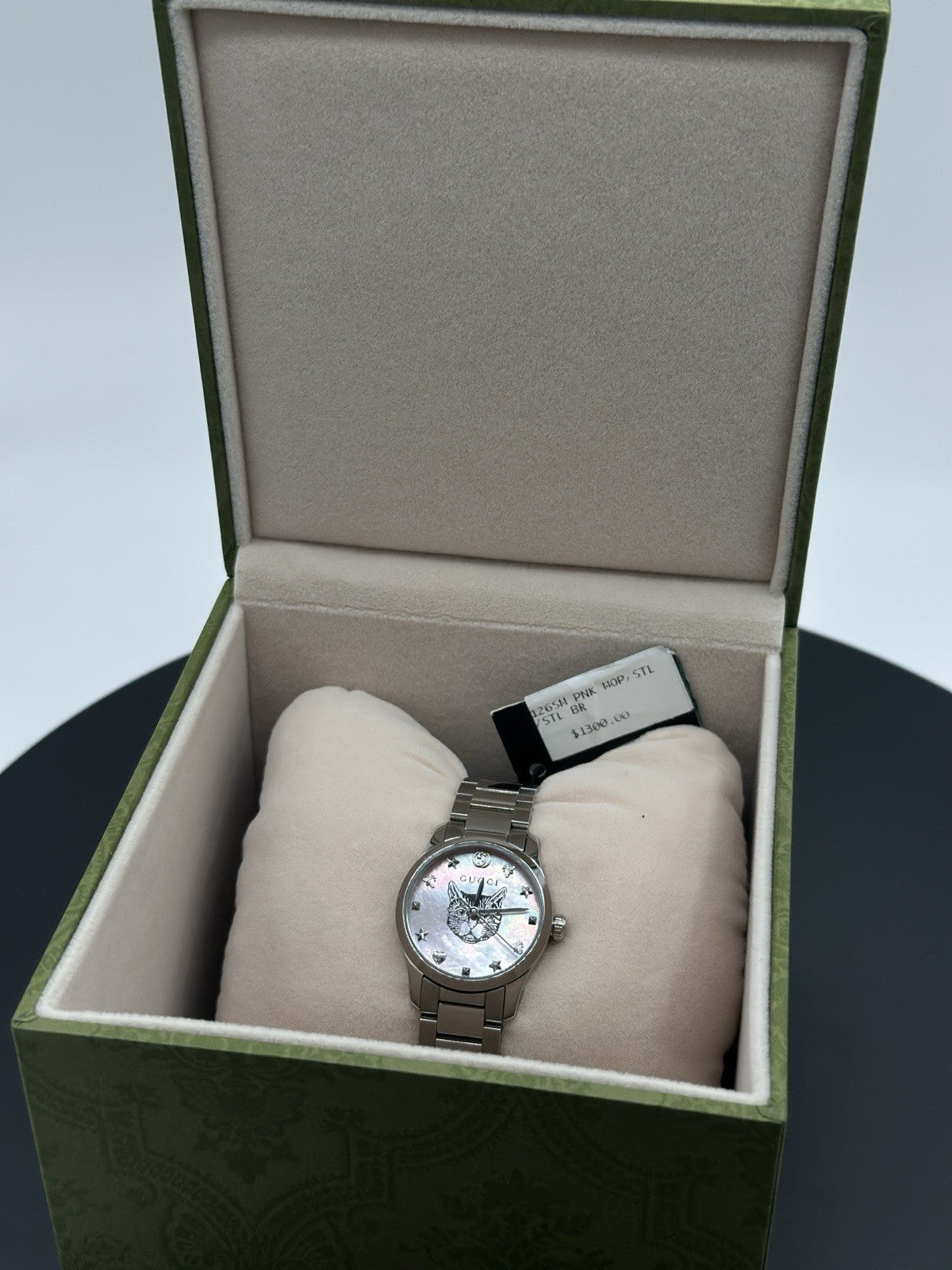 Slightly used watch, in great condition. Comes with tag, manual, card from Gucci and box. 8.5/10 condition with a new battery.